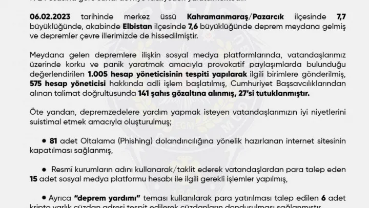 Emniyet Genel Müdürlüğü Siber Suçlarla Mücadele Daire Başkanlığı, kanunların verdiği yetki çerçevesinde, suç ve suçlularla mücadele amacıyla, internet ortamında 7 gün 24 saat esasına göre sanal faaliyetleri yürütüyor. Meydana gelen depremlere ilişkin sosyal medya platformlarında, vatandaşlar üzerinde korku ve panik oluşturmak amacıyla provokatif paylaşımlarda bulunduğu değerlendirilen bin 5 hesap yöneticisinin tespiti yapılarak ilgili birimlere gönderildi. 575 hesap yöneticisi hakkında ise adli işlem başlatıldı. Ardından Cumhuriyet Başsavcılıklarından alınan talimat istikametinde 141 şahıs gözaltına alınırken, 27 kişi ise tutuklandı.
