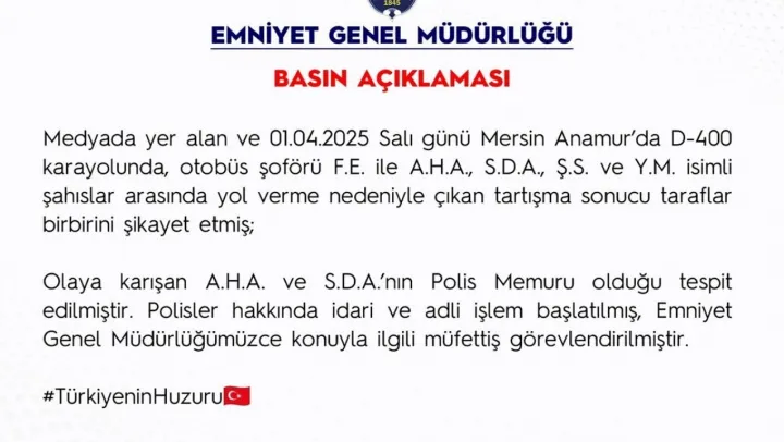 Konuyla ilgili EGM'den yapılan açıklamada, 'Medyada yer alan ve 01.04.2025 Salı günü Mersin Anamur'da D-400 karayolunda, otobüs şoförü F.E. ile A.H.A., S.D.A., Ş.S. ve Y.M. isimli şahıslar arasında yol verme nedeniyle çıkan tartışma sonucu taraflar birbirini şikayet etmiş; Olaya karışan A.H.A. ve S.D.A.'nın Polis Memuru olduğu tespit edilmiştir. Polisler hakkında idari ve adli işlem başlatılmış, Emniyet Genel Müdürlüğümüzce konuyla ilgili müfettiş görevlendirilmiştir' ifadeleri yer aldı.