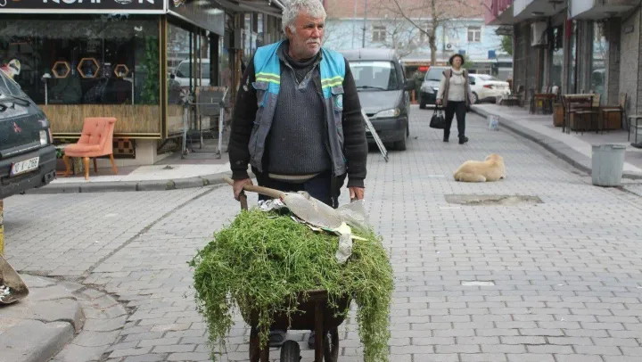 Balıkesir'in Manyas ilçesinde emekli temizlik işçisi fahri olarak ilçeyi tertemiz yapıyor.