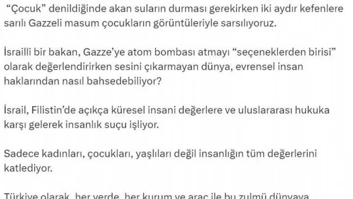 Herkes için eşit ve adil bir dünya düzeni temennisinde bulunan Emine Erdoğan, 'İsrailli bir bakan, Gazze'ye atom bombası atmayı 'seçeneklerden birisi' olarak değerlendirirken sesini çıkarmayan dünya, evrensel insan haklarından nasıl bahsedebiliyor? İsrail, Filistin'de açıkça küresel insani değerlere ve uluslararası hukuka karşı gelerek insanlık suçu işliyor. Sadece kadınları, çocukları, yaşlıları değil insanlığın tüm değerlerini katlediyor. Türkiye olarak her yerde, her kurum ve araç ile bu zulmü dünyaya duyurmaya, suçluları haykırmaya, seslerimizi barış için birleştirmeye devam edeceğiz. Mazlumun, masumun, mültecinin, ihtiyaç sahibinin din, dil, ırk temelli farklılıklar üzerinden okunmadığı, herkese eşit ve adil davranıldığı bir dünya düzeni dileğiyle' dedi.