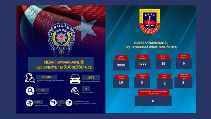 Silivri Kaymakamlığı koordinesinde İlçe Emniyet Müdürlüğü ekipleri tarafından gerçekleştirilen denetimlerde 10 bin 940 kişinin GBT sorgulaması yapıldı. Uygulamalar kapsamında 1.978 araç kontrol edildi, 61 aranan şahıs tespit edildi. Çeşitli suçlardan 9 kişi gözaltına alındı. Denetimlerde 23 yoklama kaçağı belirlenirken muhtelif miktarda uyuşturucu maddeye el konuldu.