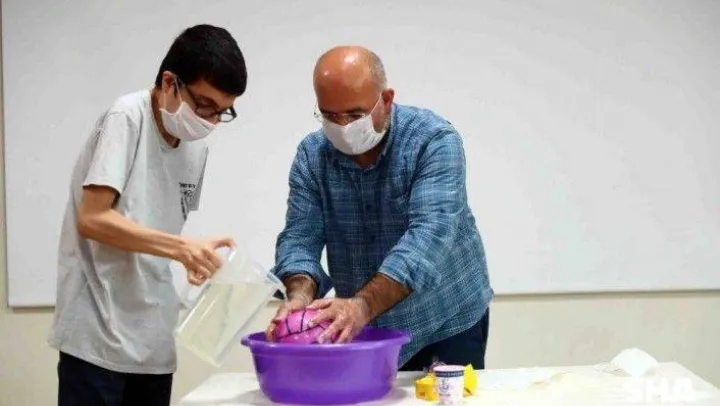 Çapraz bulaşma olmasın diye elimizi mümkün olduğu kadar kirli olan yerlere dokunulmaması gerektiğini belirten Odabaş, dokunulduğunda ellerin nasıl yıkanacağını ise plastik top üzerine sürdüğü yağı sabunla temizleyerek uygulamalı olarak gösterdi.