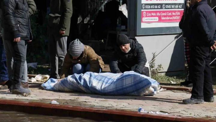 Kahramanmaraş merkezli depremde, İskenderun'daki bir enkaz altından bir kişinin cansız bedeni çıkarıldı. Battaniyeye sarılan kişinin cansız bedeninin başında yakınları gözyaşları döktü. Biri kadın iki kişi hayatını kaybeden kişinin yanına çömelerek, battaniye üzerinden yakınlarını elleriyle sevdi.