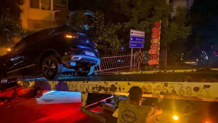Erdek'te otomobil sitenin duvarını yıkarak asılı kaldı