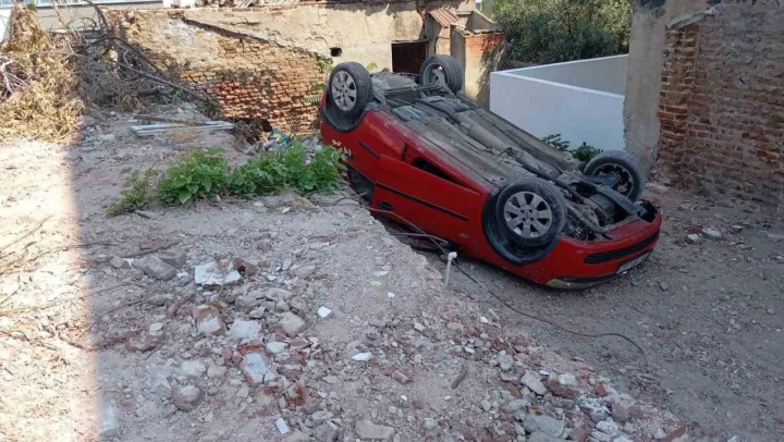 Erdek'te park etmeye çalışırken takla atan araç arsaya düştü