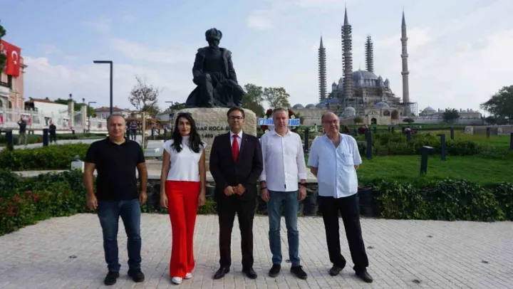 Dünya Mimarlık Günü kutlamaları çerçevesinde Edirne'deki Mimar Sinan Heykeli önünde bir araya gelen TMMOB Mimarlar Odası Edirne Temsilciliği Yönetim Kurulu üyeleri, günün anısına çelenk sunarak basın açıklaması yaptı.