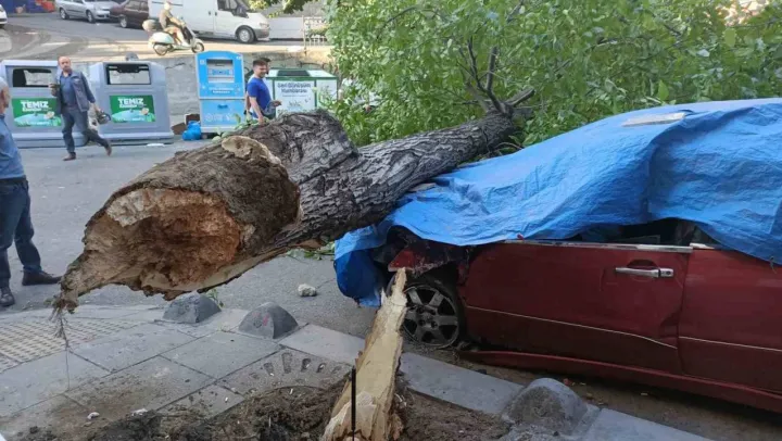 Esenler'de 10 metre uzunluğundaki ceviz ağacı, köklerinin çürümesi sonucu park halindeki 2 aracın üstüne devrildi. Olayda yaralanan olmazken otomobillerde hasar oluştu.