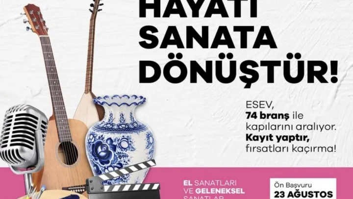 7'den 70'e her yaştan kimseyi sanatın farklı renkleriyle buluşturan Esenler Belediyesi Sanat Evi (ESEV), bu sezon da binlerce kişiye ücretsiz eğitim fırsatı sunacak. Esenler'in kültür ve sanat hayatına yön veren ESEV, yeni dönemde 74 branş ile kapılarını sanatseverlere aralayacak. ESEV'de bu dönem el sanatları ve geleneksel sanatlardan sahne sanatlarına, müzik branşlarından akademi ve okullara kadar pek çok başlıkta eğitim verilecek. Dr. Kadir Topbaş Kültür ve Sanat Merkezi'nde verilecek eğitimlere ön başvuru için son gün 5 Eylül 2023.
