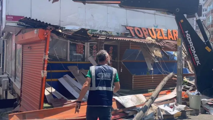 İstanbul Esenyurt'ta zabıta ve market çalışanları arasında bıçaklı kavgaya neden olan manav reyonu kepçeyle yıkıldı. İş yeri sahipleri ile zabıta ekipleri arasında ufak çaplı gerginlik yaşanırken, çevik kuvvet polislerinin müdahalesiyle yıkım tamamlandı.