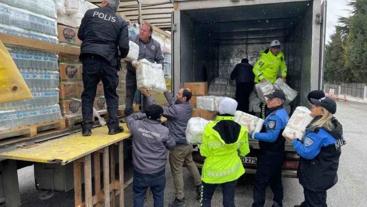 Eskişehir İl Emniyet Müdürlüğü personelleri tarafından deprem bölgesine 4 tır su, temel gıda ve hijyen malzemesi gönderildi.