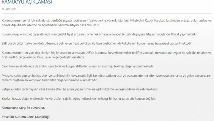'Kurumumuz, kırmızı et piyasalarında manipülatif fiyat artışlarını önlemek amacıyla dengeli bir şekilde piyasa ihtiyacı nispetinde ithalat yapmaktadır. ESK olarak çiftçi maliyetleri doğrultusunda belirlenen fiyat politikası ile hem üretici hem de tüketicinin korunmasına hassasiyet gösterilmektedir. Kurumumuzun tüm yurt dışı alımları hiçbir aracı kullanmadan, AB'de kurumsal kesimhanelerden teklifler alınarak, mevzuatlara uygun bir şekilde, rekabet ve fırsat eşitliği çerçevesinde ihale usulü ile gerçekleştirilmektedir.'