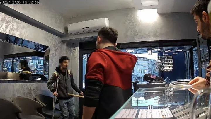Yaşananlar kuyumcunun güvenlik kameralarına saniye saniye yansıdı. Görüntülerde, şüphelinin dükkana girdikten sonra çalışanlarla tartıştığı daha sonra koltuk değnekleriyle vitrin camını kırdığı kaydedilirken dükkan çalışanları şüpheliyi etkisiz hale getirerek polis ekiplerine teslim ettiği görüldü.
