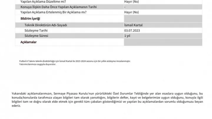 Fenerbahçe, Teknik Direktör İsmail Kartal'la 1 yıllık sözleşme imzalandığını Kamuyu Aydınlatma Platformu'na bildirdi.