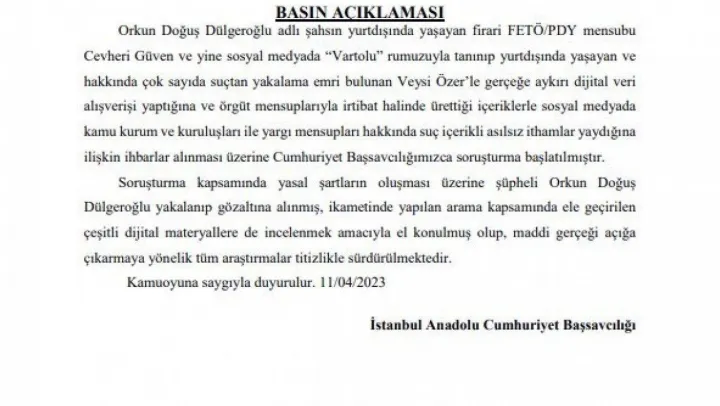 Öte yandan Başsavcılık konuyla ilgili açıklama yapmıştı. Başsavcılık yaptığı yazılı açıklamada, Orkun Doğuş Dülgeroğlu'nun yurtdışında firari olarak bulunan FETÖ/PDY mensubu Cevheri Güven ve yine sosyal medyada 'Vartolu' rumuzuyla tanınıp yurtdışında yaşayan ve hakkında çok sayıda suçtan yakalama emri bulunan Veysi Özer'le gerçeğe aykırı dijital veri alışverişi yaptığı kaydedildi. Açıklamada Dülgeroğlu'nun örgüt mensuplarıyla irtibat halinde ürettiği içeriklerle sosyal medyada kamu kurum ve kuruluşları ile yargı mensupları hakkında suç içerikli asılsız ithamlar yaydığına ilişkin ihbarlar alınması üzerine soruşturmaya başlandığı açıklanmıştı..