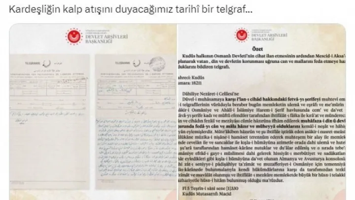 Son günlerde Filistinli Arapların 'Türklere ihanet ettiği' iddiasını çürüten arşiv belgesini Devlet Arşivleri Başkanı Prof. Uğur Ünal, sosyal medya üzerinden, 'Kardeşliğin kalp atışını duyacağımız tarihi bir telgraf' başlığıyla paylaştı.