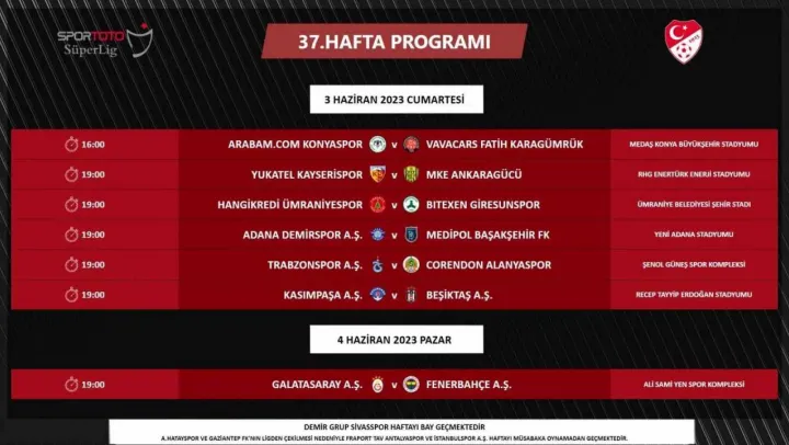Spor Toto Süper Lig'de 37. hafta programı şöyle: