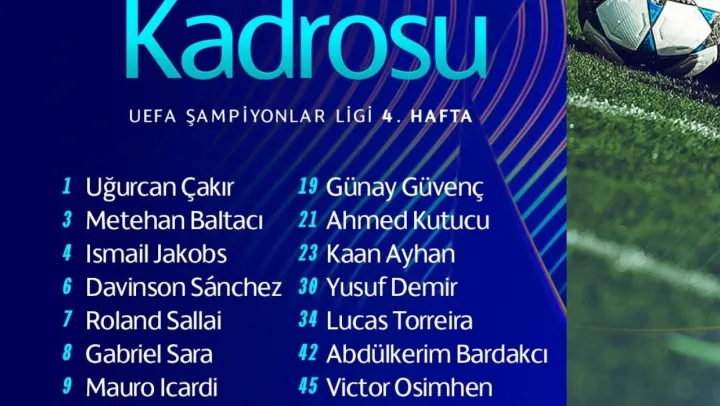 'Uğurcan Çakır, Metehan Baltacı, Ismail Jakobs, Davinson Sanchez, Roland Sallai, Gabriel Sara, Mauro Icardi, Leroy Sane, Batuhan Şen, Eren Elmalı, Berkan Kutlu, Günay Güvenç, Ahmed Kutucu, Kaan Ayhan, Yusuf Demir, Lucas Torreira, Abdülkerim Bardakcı, Victor Osimhen, Barış Alper Yılmaz, Wilfried Singo, Arda Ünyay, Mario Lemina.'