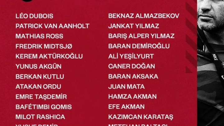 'Leo Dubois, Patrick Van Aanholt, Mathias Ross, Fredrik Midtsjö, Kerem Aktürkoğlu, Yunus Akgün, Berkan Kutlu, Atakan Ordu, Emre Taşdemir, Bafetimbi Gomis, Milot Rashica, Yusuf Demir, Okan Kocuk, Emin Bayram, Abdülkerim Bardakçı, Beknaz Almazbekov, Jankat Yılmaz, Barış Alper Yılmaz, Baran Demiroğlu, Ali Yeşilyurt, Caner Doğan, Baran Aksaka, Juan Mata, Hamza Akman, Efe Akman, Kazımcan Karataş, Metehan Baltacı, Sacha Boey, Enes Emre Büyük.'