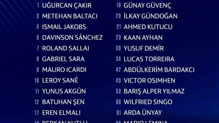 'Uğurcan Çakır, Metehan Baltacı, Ismail Jakobs, Davinson Sanchez, Roland Sallai, Gabriel Sara, Mauro Icardi, Leroy Sane, Yunus Akgün, Batuhan Şen, Eren Elmalı, Berkan Kutlu, Günay Güvenç, İlkay Gündoğan, Ahmed Kutucu, Kaan Ayhan, Yusuf Demir, Lucas Torreira, Abdülkerim Bardakcı, Victor Osimhen, Barış Alper Yılmaz, Wilfried Singo, Arda Ünyay, Mario Lemina.'