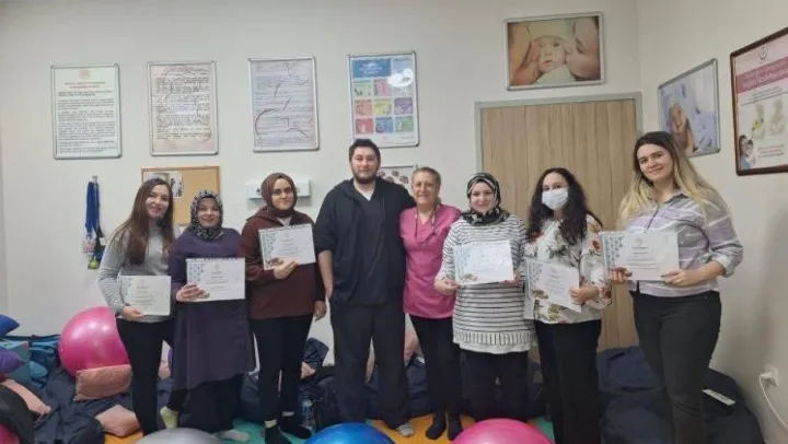 Bilinçli anneler, sağlıklı nesiller yetiştirmek amacıyla Gebe Okulu eğitimlerine katılan anne adaylarına eğitim sonunda katılım belgesi veriliyor. Gebe okulunda anne adaylarına uygulamalı olarak yeni doğan bebek bakımı, emzirme teknikleri, lohusalık, gebelik sonrası beslenme gibi bir anne adayının ihtiyaç duyabileceği konularda eğitim veriliyor. Eğitimi tamamlayan anne adayları, Kadın Doğum Uzmanı Op. Dr. Emre Sakarya ve Gebe Okulu sorumlusu Emine Ayanoğlu teşekkür etmek amacı ile Başhekim Dr. Öğrt. Üyesi Erhan Arıkan ile bir araya geldi. Eğitim almak isteyen anne adaylarının gebe okuluna her zaman kayıt yaptırabileceği belirtildi.