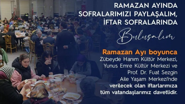 Ramazan ayı boyunca Zübeyde Hanım Kültür Merkezi, Yunus Emre Kültür Merkezi ve Prof. Dr. Fuat Sezgin Aile Yaşam Merkezi'nde verilecek olan iftarlara tüm vatandaşlar davetli.