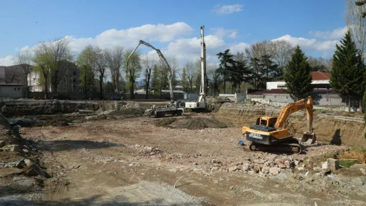 Depreme dayanıksız olduğu belirlenerek yıkılan ve yeniden yapımına başlanan Gölcük Hükümet Konağı'nda çalışmalar sürüyor.
