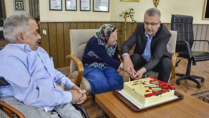 Bursa'nın Karacabey ilçesinde yaşayan görme engelli Zeynep Karakuş, 59'uncu yaşını Karacabey Belediye Başkanı Ali Özkan ile makamda kutladı.