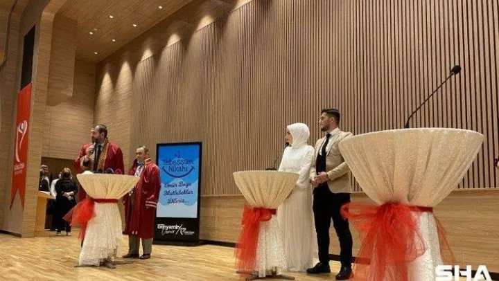 Güngören'de sosyal sorumluk projesi kapsamında başlatılan '+1 Tebessüm Nikah' ile ilk imzayı atan Büşra ile Yunus Emre çiftinin nikahı Down Sendromlu Güngör Aktaş ile Güngören Belediye Başkanı Bünyamin Demir kıydı.