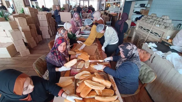 Kaymakamlık ve belediye tarafından depremzedelere ulaştırılmak üzere aile destek merkezlerinde çalışan kadınlar tarafından Norduz Sofrasında hazırlanan 20 bin kumanya bölgeye gönderildi.