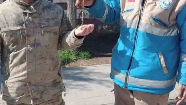 Haliliye Belediyesi, depremden ağır şekilde etkilenen Adıyaman'da temizlik desteğini sürdürürken, görevli personel Mehmet Aslan, bulduğu altın kolyeyi görevli askerlere teslim etti.