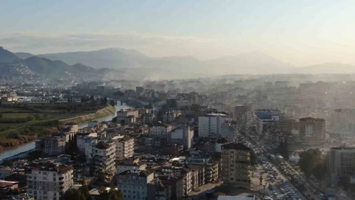 Hatay'da enkaz çalışmalarının ardından gökyüzü toz bulutuyla kaplandı