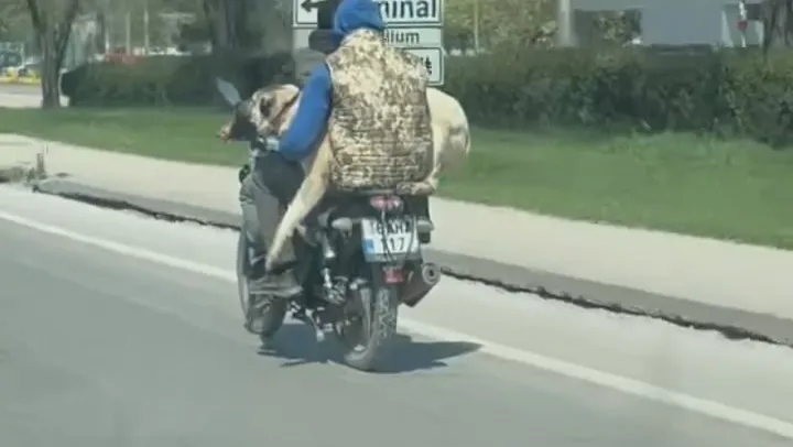 Bursa'da 2 kişi kangal cinsi köpeği aralarına alıp motosikletle trafikte seyrederken görüntülendi. Hem köpeğin canını hem de kendi canlarını hiçe sayan motosikletli şahıslara sosyal medyada birçok kişi tepki gösterdi.