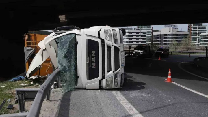 TEM Otoyolu'nda hızını alamayan kamyon, bariyerlere çarparak yan yattı. Kazada yaralanan araç sürücüsü hastaneye kaldırılırken, kamyonun dorsesinde taşıdığı asfalt kumları şarampole döküldü.
