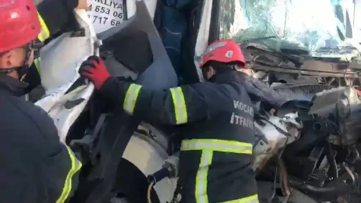 TEM Otoyolu Kocaeli geçişinde 3 kamyon zincirleme kazaya karıştı. Çarpışmanın şiddetiyle hurdaya dönen kamyonda sıkışan yolcu, itfaiye ekiplerinin uzun uğraşları neticesinde çıkarıldı.