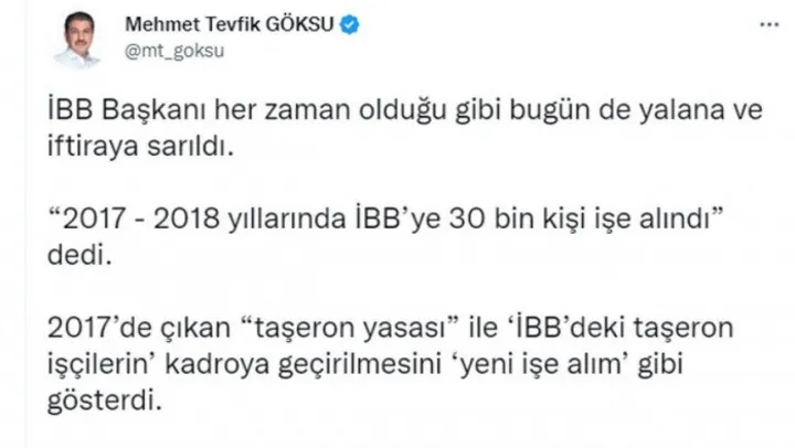 İBB AK Parti Grup Başkanvekili Mehmet Tevfik Göksu, İstanbul Büyükşehir Belediye Başkanı Ekrem İmamoğlu'nun açıklamalarını yalanladı. İBB Başkanı Ekrem İmamoğlu'nun, dönemin İstanbul Büyükşehir Belediye Başkanı Mevlüt Uysal'ın, 28 Eylül 2017-31 Aralık 2018 tarihleri arasında 30 bin kişiyi işe aldığını söylediğini belirten İBB AK Parti Grup Başkanvekili Mehmet Tevfik Göksu, bu işe alımların, 2017 yılında çıkan 'taşeron yasası' ile gerçekleştirdiğini açıkladı. 'İBB'deki taşeron işçilerin' kadroya geçirilmesini, İmamoğlu'nun 'yeni bir işe alım' gibi gösterdiğini ve algı yapmaya çalıştığını aktaran Göksu, 'İBB Başkanı her zaman olduğu gibi bugün de yalana ve iftiraya sarıldı' dedi.