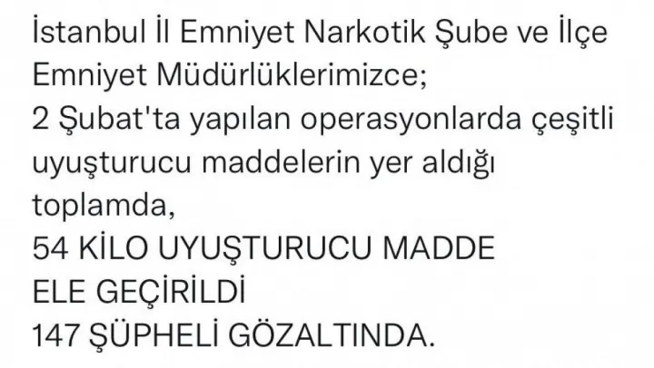'İstanbul İl Emniyet Narkotik Şube ve İlçe Emniyet Müdürlüklerimizce; 2 Şubat'ta yapılan operasyonlarda çeşitli uyuşturucu maddelerin yer aldığı toplamda, 54 kilo uyuşturucu madde ele geçirildi 147 şüpheli gözaltında. İstanbul Emniyetimize ve Kahraman Polislerimize tebrikler'.