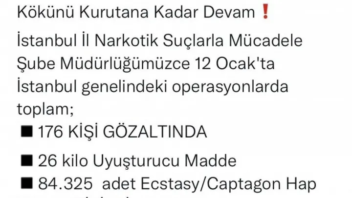 İstanbul İl Narkotik Suçlarla Mücadele Şube Müdürlüğümüzce 12 Ocak'ta İstanbul genelindeki operasyonlarda toplam;176 Kişi gözaltında. 26 kilo uyuşturucu madde, 84.325 adet ecstasy/captagon hap ele geçirildi. Kahraman Polislerimize tebrikler.