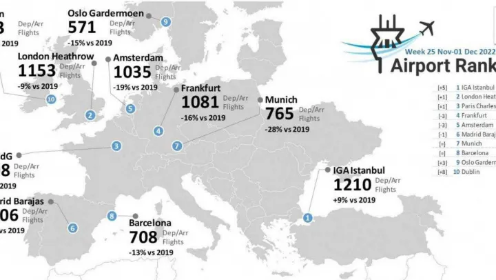 Avrupa Hava Seyrüsefer Emniyet Teşkilatı'nın (EUROCONTROL) 25 Kasım - 1 Aralık 2022 arasındaki istatistiklerine göre; İGA İstanbul Havalimanı, günde ortalama bin 210 uçuş ile Avrupa'nın en yoğun havalimanı oldu. İGA'yı bin 153 uçuş ile Londra Heathrow Havalimanı ve bin 108 uçuş ile Paris-Charles de Gaulle Havalimanı takip etti. Sivil Havacılık Genel Müdürlüğü'nden yapılan açıklamaya göre ise, 'İstanbul Havalimanı Avrupa'daki en yoğun 10 havalimanı içerisinde 2019 yılı performansının üzerine çıkabilen tek havalimanı olarak öne çıkmıştır'' ifadelerine yer verildi.