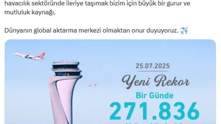 İstanbul Havalimanı İşletmecisi İGA'nın sosyal medya hesabından yapılan açıklamada, 'İGA İstanbul Havalimanı dün yolcu trafiğinde yeni bir rekora imza atarak önemli bir dönüm noktasına imza attı ve tek bir günde 271 bin 836 yolcuyu ağırladı. Ülkemizi küresel havacılıkta ön sıralara taşımak bizim için büyük bir gurur ve mutluluk kaynağı. Dünyaya açılan öncü bir kapı olmaktan gurur duyuyoruz' ifadelerine yer verildi.