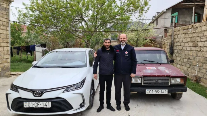 Azerbaycan'da eski model kırmızı bir aracın üzerine yüklediği yardım malzemelerini Türkiye'deki depremzedelere göndermek için yola çıktığı esnada çekilen bir fotoğraf ile depremin simgelerinden biri olan Server Beşirli'yi, Bakü Din Hizmetleri Müşaviri ve Türkiye Diyanet Vakfı Mütevelli Heyeti Üyesi İhsan Açık ziyaret etti.