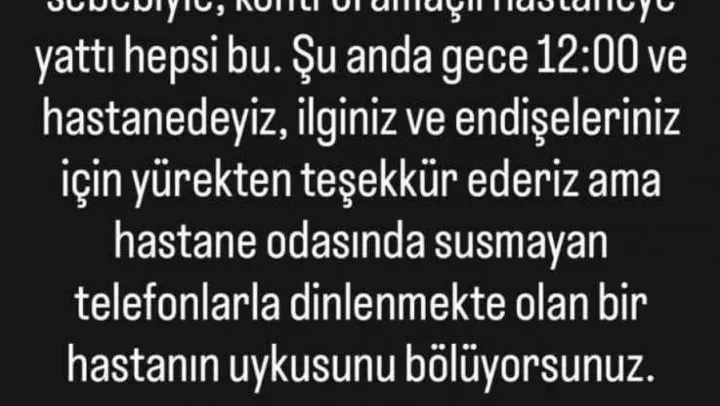 'Babam kalp krizi geçirmedi, yoğun bakımda da değil, ufak bir rahatsızlık sebebiyle, kontrol amaçlı hastaneye yattı hepsi bu. Şu anda gece 12:00 ve hastanedeyiz, ilginiz ve endişeleriniz için yürekten teşekkür ederiz ama hastane odasında susmayan telefonlarla dinlenmekte olan bir hastanın uykusunu bölüyorsunuz.'