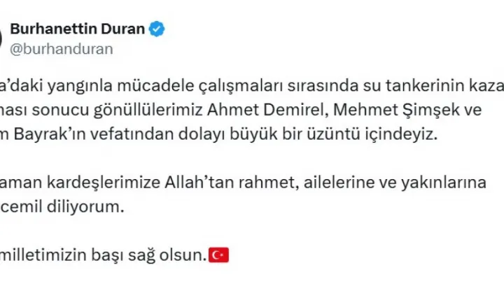 Cumhurbaşkanlığı İletişim Başkanı Burhanettin Duran, Bursa'da orman yangınına müdahale sırasında meydana gelen kazada hayatını kaybeden gönüllüler için sosyal medya hesabından taziye mesajı yayımladı. Duran mesajında, 'Bursa'daki yangınla mücadele çalışmaları sırasında su tankerinin kaza yapması sonucu gönüllülerimiz Ahmet Demirel, Mehmet Şimşek ve Kazım Bayrak'ın vefatından dolayı büyük bir üzüntü içindeyiz' ifadelerini kullandı.
