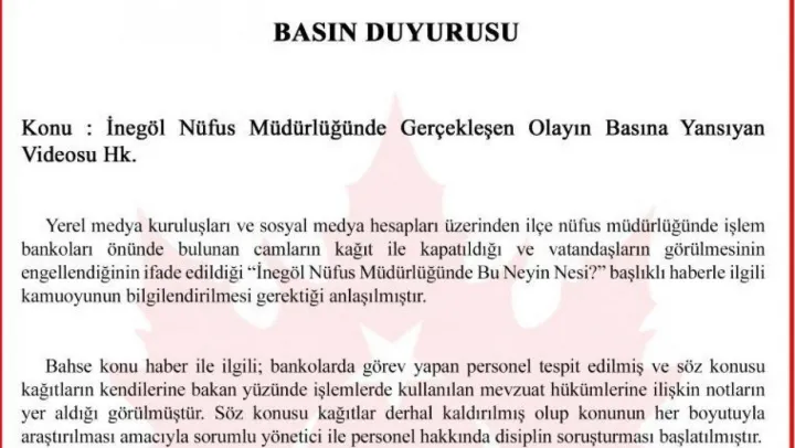 Sosyal medyada paylaşılan görüntülerde iddiaya göre İnegöl Nüfus Müdürlüğü'nde vatandaşla memur arasındaki cama A4 kağıtları yapıştırılmıştı. Konu ile ilgili Bursa Valiliğinden yapılan açıklamada, 'Yerel medya kuruluşları ve sosyal medya hesapları üzerinden ilçe nüfus müdürlüğünde işlem bankoları önünde bulunan camların kağıt ile kapatıldığı ve vatandaşların görülmesinin engellendiğinin ifade edildiği, 'İnegöl Nüfus Müdürlüğünde Bu Neyin Nesi?' başlıklı haberle ilgili kamuoyunun bilgilendirilmesi gerektiği anlaşılmıştır. Bahse konu haber ile ilgili, bankolarda görev yapan personel tespit edilmiş ve söz konusu kağıtların kendilerine bakan yüzünde işlemlerde kullanılan mevzuat hükümlerine ilişkin notların yer aldığı görülmüştür. Söz konusu kağıtlar derhal kaldırılmış olup, konunun her boyutuyla araştırılması amacıyla sorumlu yönetici ile personel hakkında disiplin soruşturması başlatılmıştır. Kamuoyuna saygıyla duyurulur' ifadelerine yer verildi.