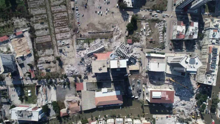 Kahramanmaraş merkezli 3 gün önce meydana gelen depremlerin ardından İskenderun'da deniz seviyesi yükseldi. Deniz seviyenin yükselmesiyle sahil kesiminin bir bölümü sular altında kaldı. Depremde yıkılan binalar ve hasar alan yerler dron ile havadan görüntülendi.