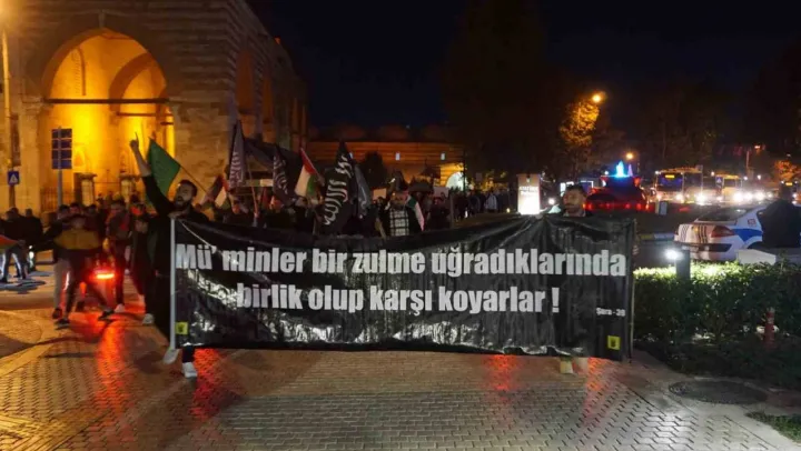 Edirne'de Eski Cami'de akşam namazını kılan vatandaşlar, İsrail'in Gazze'ye yönelik saldırılarını kınamak ve hayatını kaybeden Filistinliler için dua etmek amacıyla Selimiye Meydanı'nda toplandı. Ellerinde Türk bayrağı ve Filistin bayrağı taşıyan grup İsrail ve ABD'ye karşı sloganlar attı.