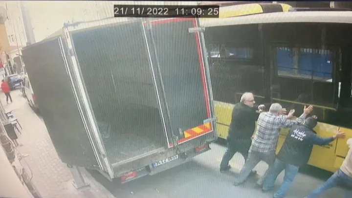 İstanbul'da akıl almaz kaza kamerada: Sıkışan şoförü 10 tonluk otobüsü itip kurtardılar