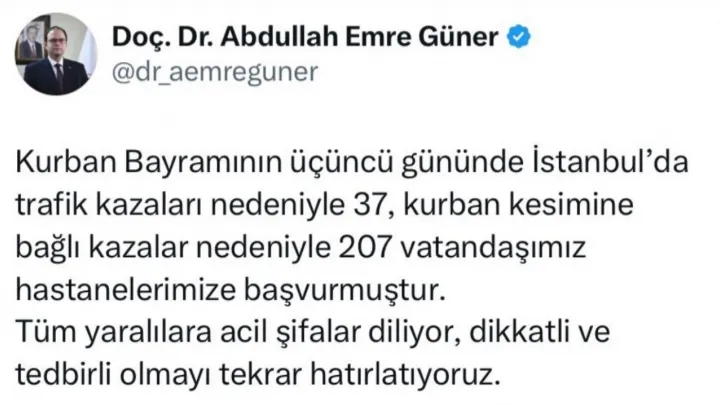 İstanbul İl Sağlık Müdürü Doç. Dr. Abdullah Emre Güner sosyal medya hesabından yaptığı açıklamada, 'Kurban Bayramının 3'üncü gününde İstanbul'da trafik kazaları nedeniyle 37, kurban kesimine bağlı kazalar nedeniyle 207 vatandaşımız hastanelerimize başvurmuştur. Tüm yaralılara acil şifalar diliyor, dikkatli ve tedbirli olmayı tekrar hatırlatıyoruz' ifadelerine yer verdi.
