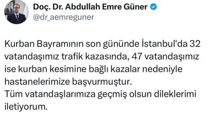 İstanbul İl Sağlık Müdürü Doç. Dr. Abdullah Emre Güner sosyal medya hesabından yaptığı açıklamada, 'Kurban Bayramının son gününde İstanbul'da 32 vatandaşımız trafik kazasında, 47 vatandaşımız ise kurban kesimine bağlı kazalar nedeniyle hastanelerimize başvurmuştur. Tüm yaralılara acil şifalar diliyor, dikkatli ve tedbirli olmayı tekrar hatırlatıyoruz' dedi.