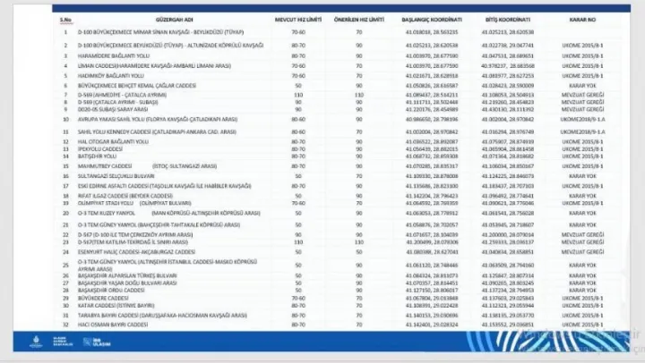 D100 Karayolu Büyükçekmece TÜYAP ile Altunizade Köprülü Kavşağı arasında saatte 80 kilometre olan hız limiti 90 kilometreye çıkarıldı. Beşiktaş Barbaros Bulvarı'nda maksimum hız limiti ise saatte 70 kilometre olarak değişirken, Hasdal-Okmeydanı Bağlantı Yolu'nun yeni hız limiti saatte 90 kilometre, O-3 TEM Ayrımı-Basın Ekspress Yolu'ndaki yeni limit saatte 100 kilometre olarak güncellendi. 4. Levent-TEM Bağlantı Yolu'nun yeni hız sınırı saatte 90 kilometre olurken, O3 Tem Ayrımı - Basın Ekspress yolu - (Mahmutbey Batı Kavşağı- Atatürk Havaalanı Kavşağı - Havaalanı Caddesi) saatte 110 kilometreye çıkarıldı. D100 Harem - Tuzla arası saatte 90 kilometreye, Söğütlüçeşme Köprülü Kavşağı - Uzunçayır Köprülü Kavşağı Arası saatte 90 kilometreye çıkarıldı. Bolluca - İhsaniye Yolu, Tantavi, Vecdi Diker ve Halit Ulukurt Tüneli ise saatte 90 kilometreye çıkarıldı. Kağıthane Anadolu Caddesi saatte 50 kilometreden 70 kilometre, Arnavutköy - Habipler Yolu (Sultangazi - Fenertepe Arası), Hal Otogar Bağlantı Yolu ve Haramidere Bağlantı yolu saatte 90 kilometre olarak güncellendi.