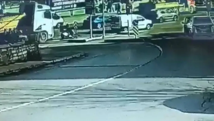 Kağıthane'de seyir halinde olan hafriyat kamyonu sürücüsü, yanından geçmek isteyen motosikletli kuryeye çarptı. Feci kaza kameralara yansırken, kamyonun ezdiği motosikletin üstündeki genç kurye yola atlayarak son anda kurtuldu.
